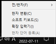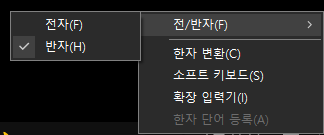 윈도우 아래에 영문일 때 'A', 국문일 때 '가'로 표시되는 곳을 우클릭하면 아래처럼 전/반자 화면이 나오고 여길 통해서 전자 반자 설정을 변경할 수 있습니다.