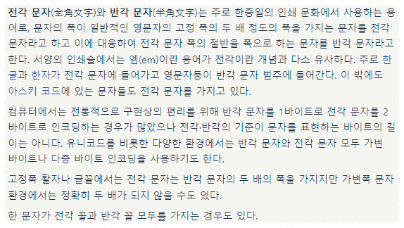 전각문자 / 반각문자라고도 하는데요. 아래 위키백과의 설명입니다.