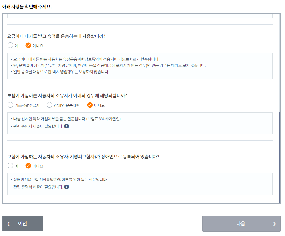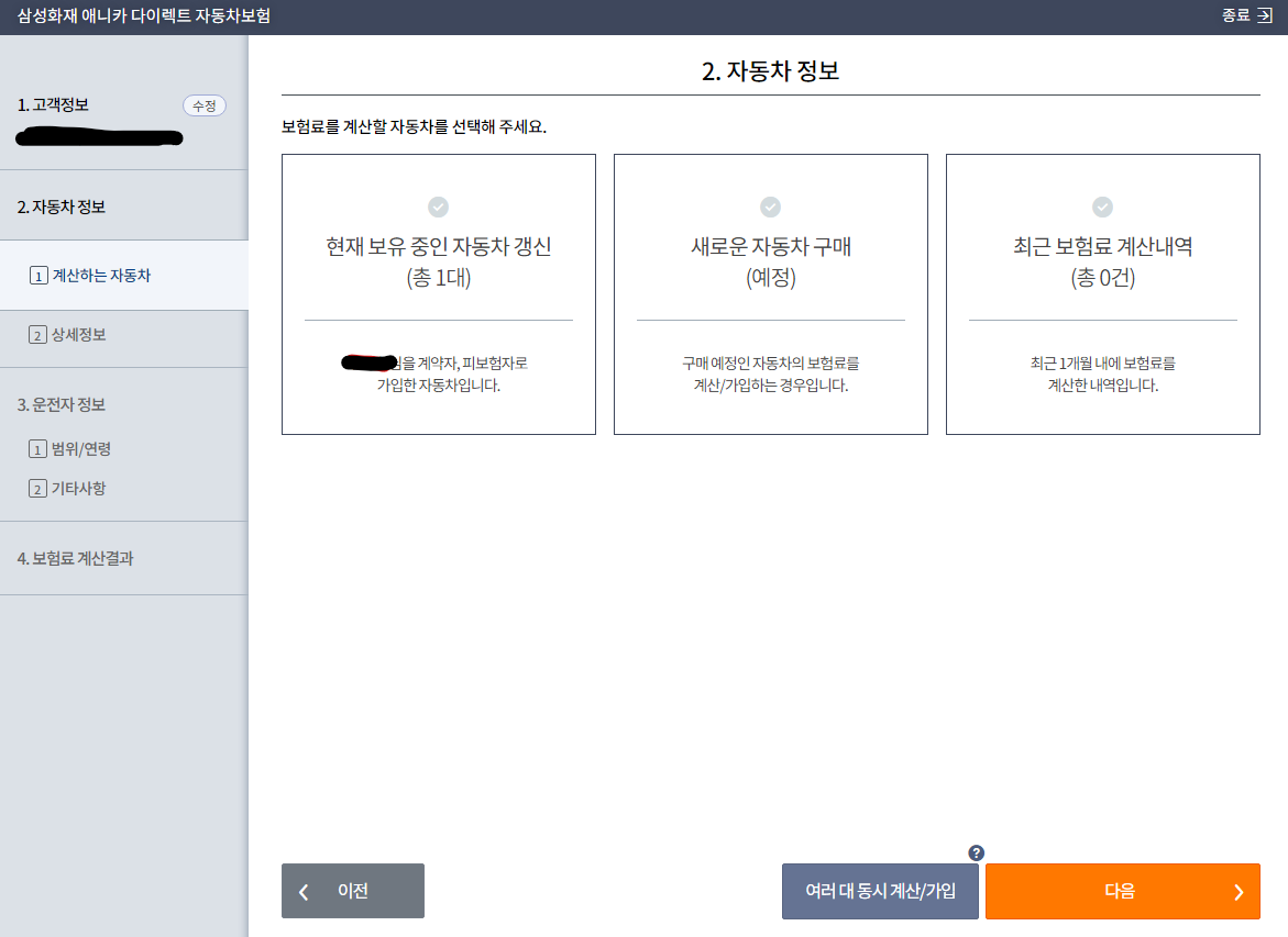 이렇게 차량 정보를 입력하고 나면 운전자 정보를 고르게 되어 있어요.