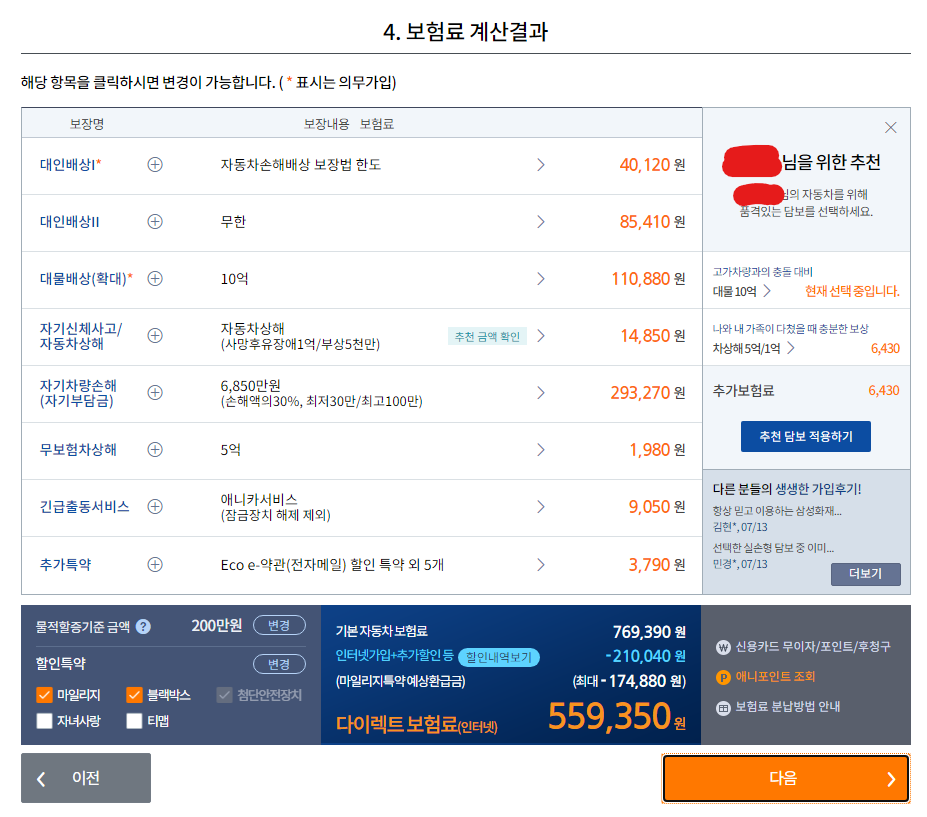 보험은 혹시 모르는 일에 대한 대비를 위한 것이니까. 최대금액으로 하시길 추천합니다.