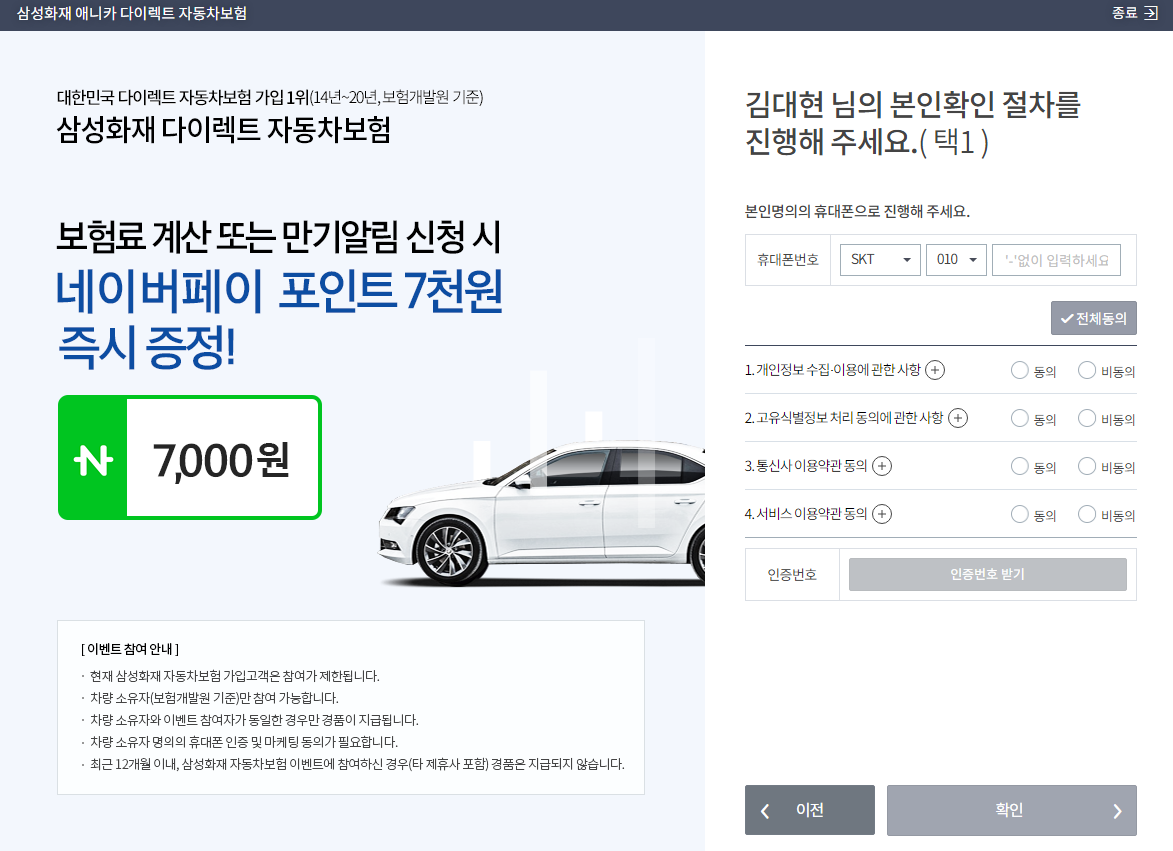 삼성화제 다이렉트 보험 웹페이지에 접속해서 개인정보를 입력해 줍니다.