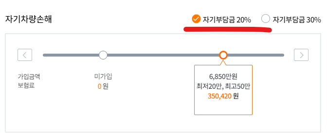 이 항목은 자기부담금이라는 항목이 있는데 사고가 나면 내가 부담해야 하는 비율을 선택하게 됩니다.