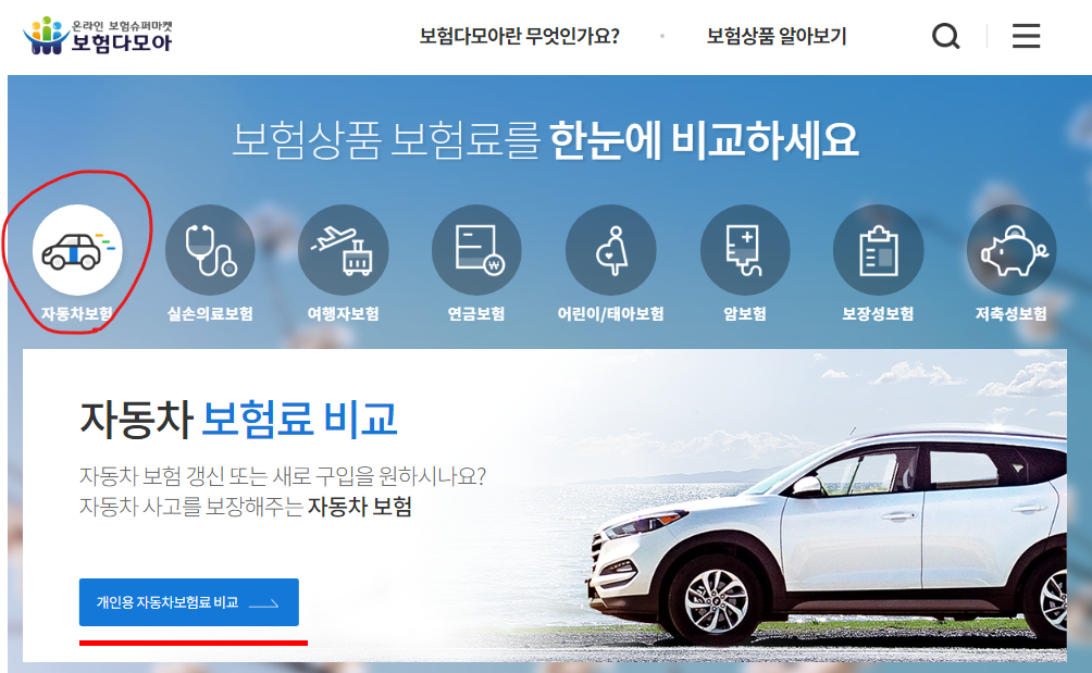 홈페이지에 들어가면 이런 화면이 나오는데, 자동차 보험을 선택하세요~