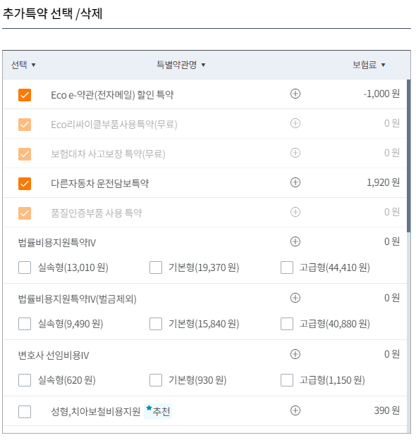여기까지 특약들은 따로 비용이 들지 않으니 그냥 선택해 주시면 되요~!!!