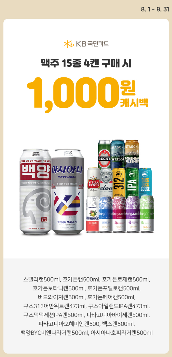 [8월 맥주 행사 KB 국민카드 결제 시 1,000원 캐시백 이벤트]