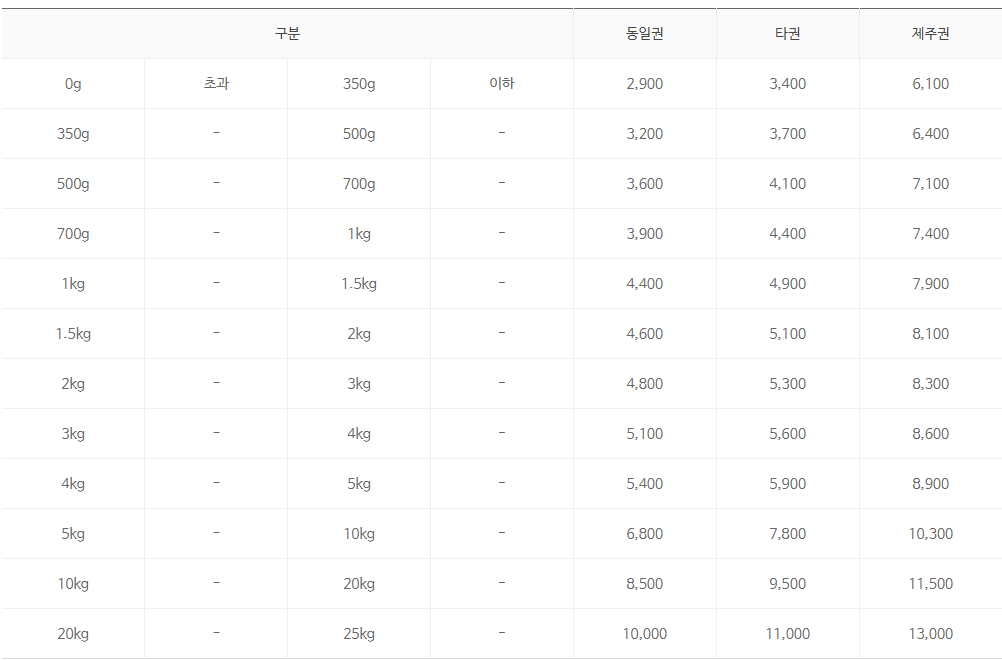 | 0kg | 초과 | 0.5kg | 이하 | 1,600원 |